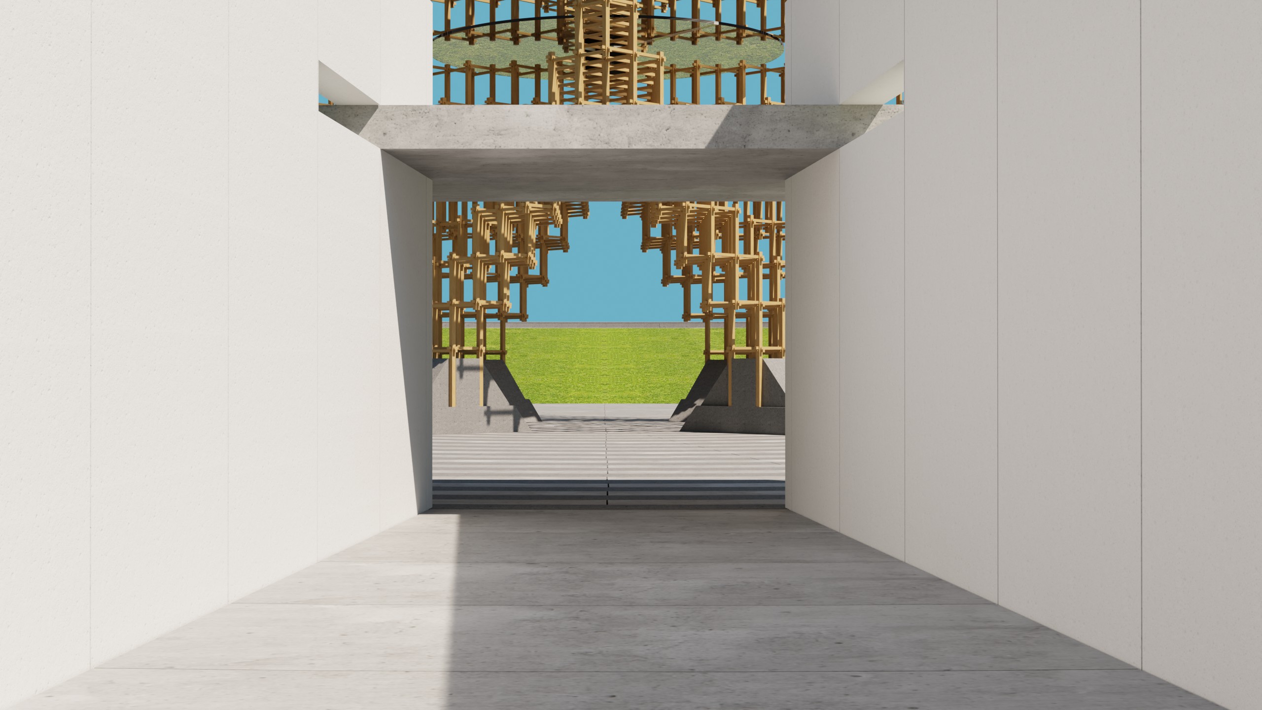 Forged from the sloping angles of a rhombohedron, titanium members weave together to form hash signs on its four sides and on top as social media weaves into the fabric of our technological times. This symbol turns the data of billions of souls vying to be seen and heard into meta-data, categorizes it and makes it searchable; to share joys, beauty, injustices, grief…. and so much more, elevating our humanity. Yet, represented by the perfection of its titanium surface scarred by scratches, these forces of light are tempered by the forces of darkness by its use to tear down our humanity. One can sit on its timber benches and reflect on this symbols’ meaning to them in their personal lives as the reflecting pools reflect its aqua color onto its surface.