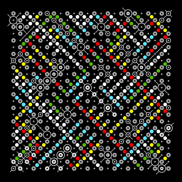 QUADRABAR I is a visualization in perspective looking directly overhead of a structure of a grid of cubes intersected by bars. They shift up in down, undulating in a wave like formation assembling an implied geographic terrain. Infused with 14 colors plus black and white, it comes alive as an optical tapestry in a symphony of color.